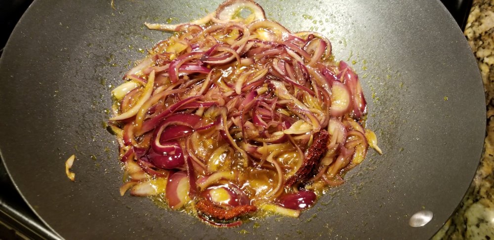 - Heat the mustard oil on medium flame and add dry red chillis, cloves, cardamom, cinnamon and bay leaf. Add sugar, salt and black pepper. Add onions and Saute till the onions are translucent and redish in color.