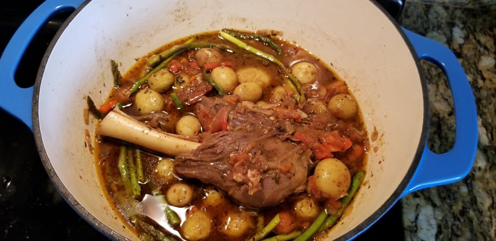 - Stew on low for another 2 hours till till meat is falling off turning the lamb shank over a couple of times.