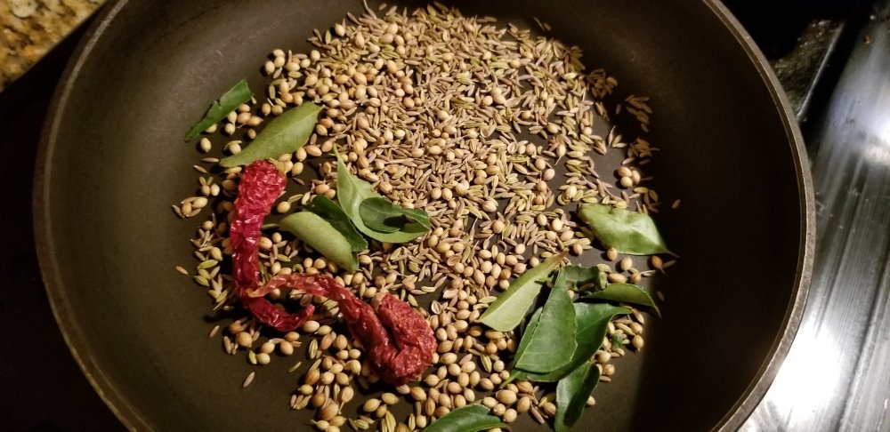 - Dry roast the whole spices in a pan on medium flame till there is a good aroma of roasted spices. Let it cool and run in a processor to get a coarse mix.