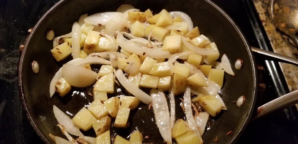 - In a pan on medium flame, heat oil and once hot, saute 1/4 teaspoon whole cumin, add onions and saute for a minute.