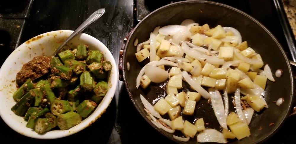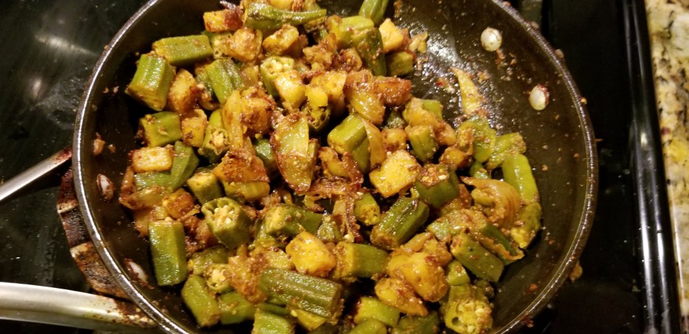 - Add the Okra, sprinkle some water, adjust salt and saute till potatoes are done and the okra is cooked (keep covered and mix from time to time).